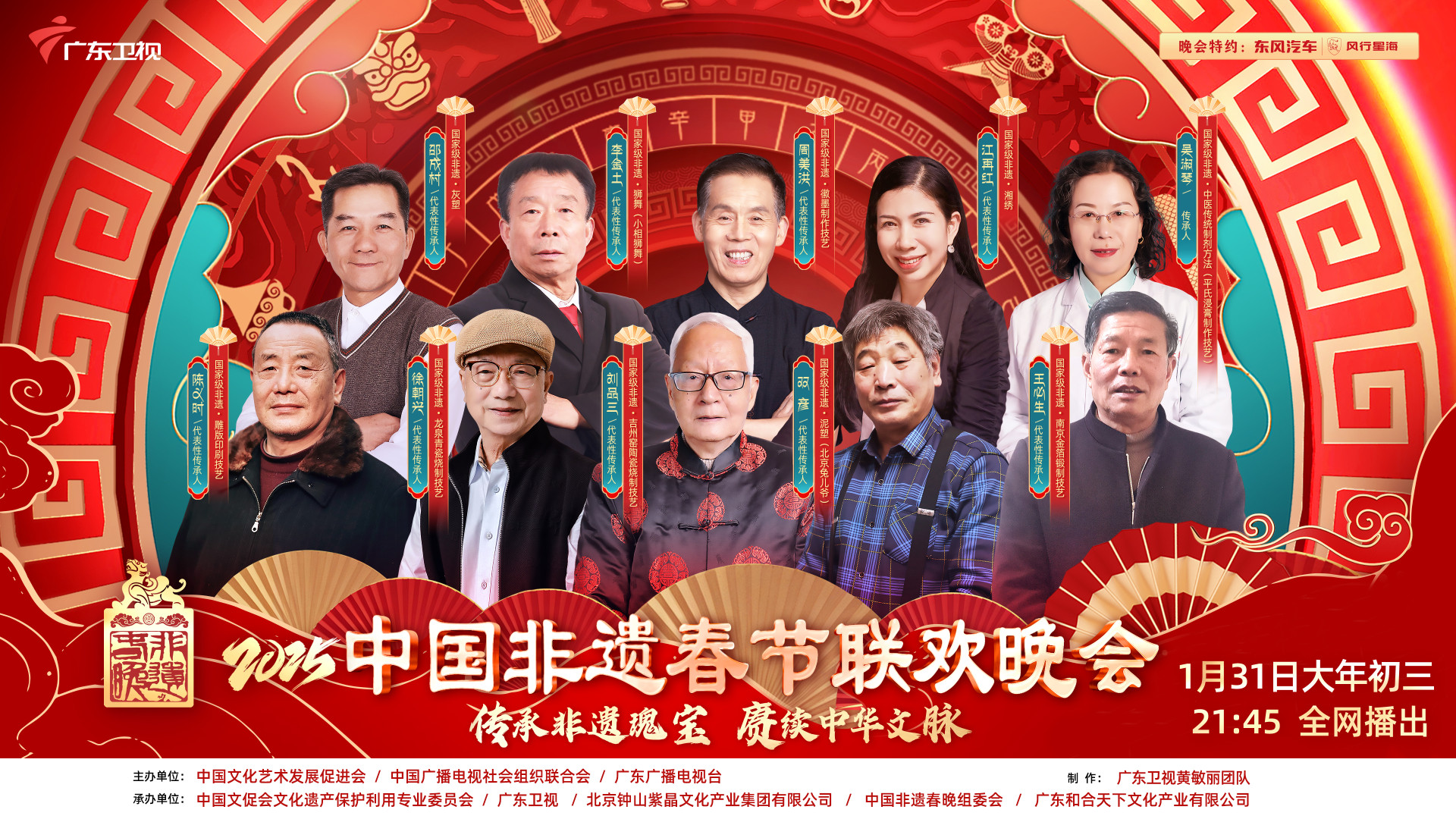 由中国文化艺术发展促进会、中国广播电视社会组织联合会、广东广播电视台主办,广东和合天下文化产业有限公司、北京钟山紫晶文化产业集团有限公司、广东卫视、中国非遗春晚组委会承办,东风汽车旗下风行星海品牌特约播出的2025中国非遗春节联欢晚会于大年初三在广东卫视、大湾区卫视海外版播出,积极助力“非遗传承人”“非遗技艺”“非遗故事”从幕后走向台前。