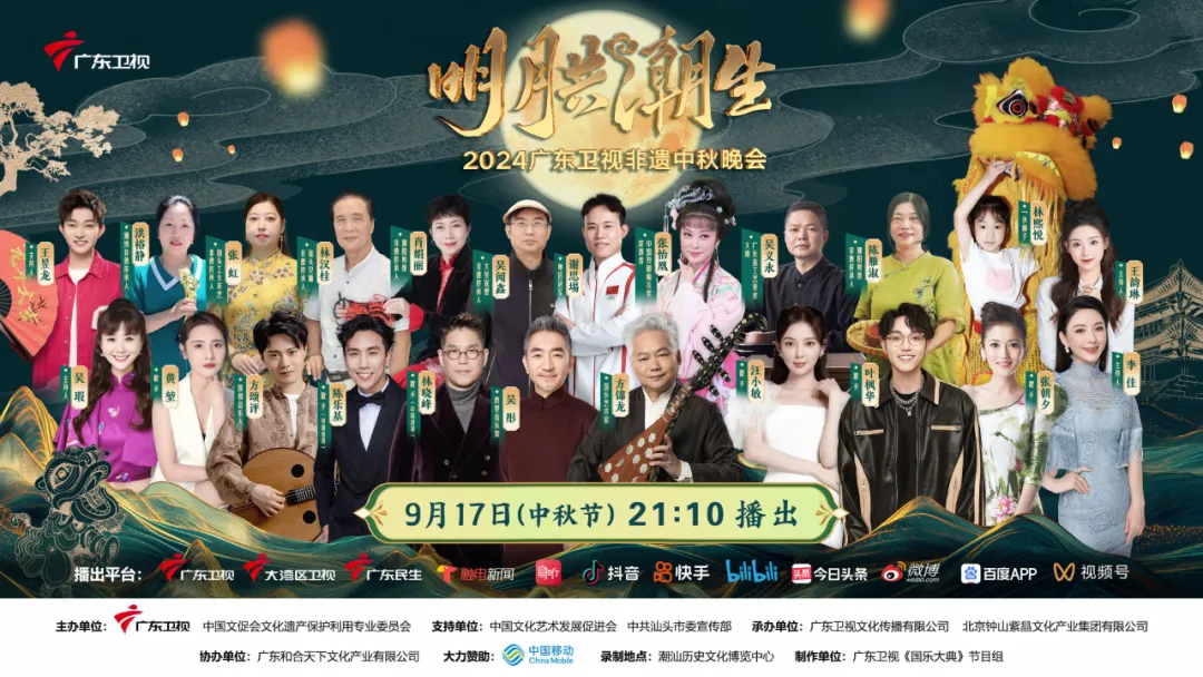 由中国文促会文化遗产保护利用专业委员会、广东卫视主办,中国文化艺术发展促进会、汕头市委宣传部支持,广东卫视文化传播有限公司 、北京钟山紫晶文化产业集团有限公司承办,广东和合天下文化产业有限公司协办的《“明月共潮生”2024广东卫视非遗中秋晚会》于中秋节晚21:20在广东卫视、大湾区卫视、广东民生频道播出,并在触电新闻、粤听、抖音、快手、哔哩哔哩、今日头条、微博、百度APP、视频号等平台同步播出,与全国观众欢度月圆之夜。 《“明月共潮生”2024广东卫视非遗中秋晚会》,将团圆之情与非遗华彩巧妙融合。晚会中,奥运冠军谢思埸,携手吴彤、方锦龙、林晓峰、汪小敏、陈乐基、方颂评、叶枫华、黄堃、 张朝夕等嘉宾,深度挖掘并展示广东非物质文化遗产的独特魅力,漫步于岭南文化的深邃长廊,让每一份思念都有归宿,让每一份传承都更加贴近人心,为这场粤式中秋佳宴添上最美注脚。同时也在传播方面实现了与演艺嘉宾、非遗传承人、汕头市融媒矩阵等多方的共创,生产出了近百条高品质的融媒传播素材。