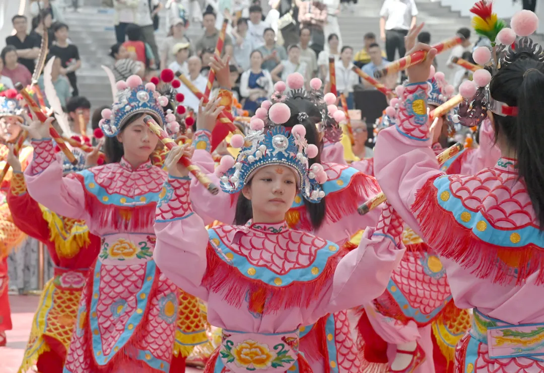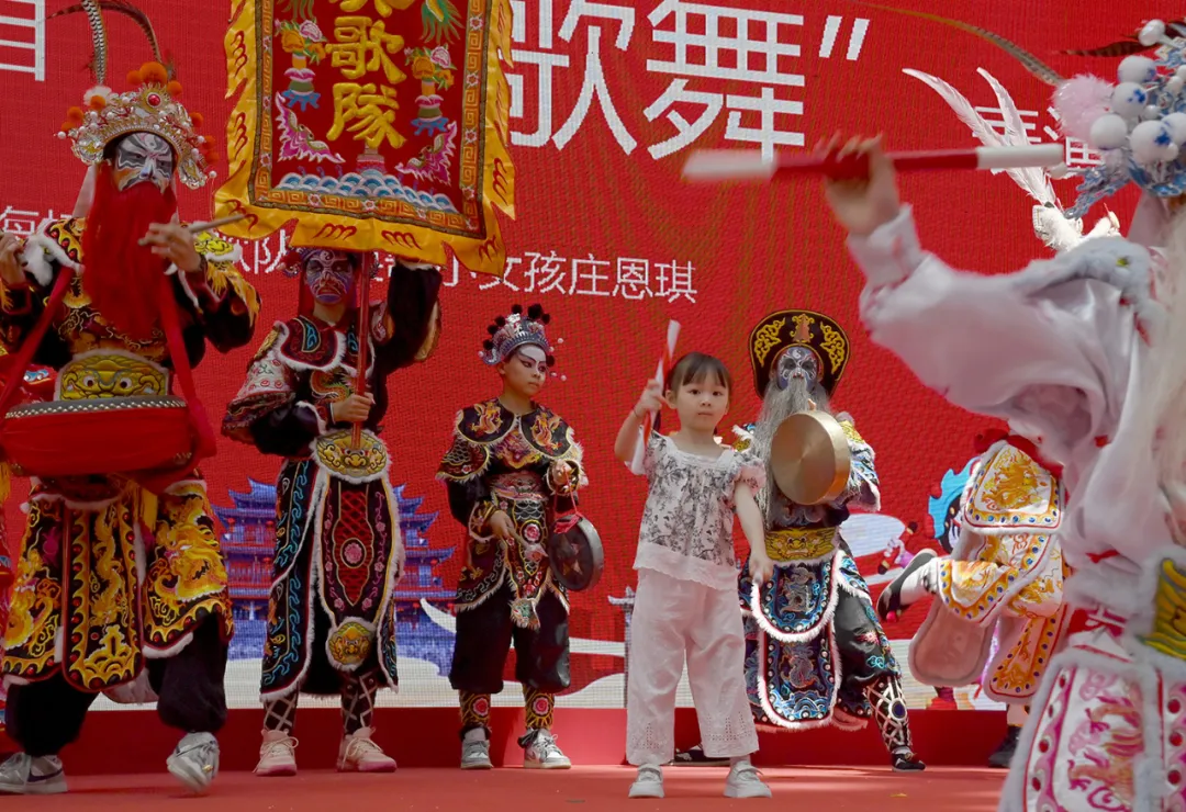 原文化部副部长、国家博物馆首任馆长潘震宙宣布 “2024 潮汕非遗嘉年华”活动隆重开幕。现场多支英歌舞队伍献上精彩英歌舞表演,展现国家级非遗魅力。此前,因热爱英歌舞走红网络平台的潮阳区贵屿镇玉窖村“英歌舞小女孩”庄恩琪也来到现场,她与男子英歌队、女子英歌队燃情共舞英歌,赢得观众们的阵阵掌声。据庄恩琪的父亲庄镕强介绍,5岁的女儿为了参加展演,在家里练习了好几天,希望通过展演活动宣传推广潮汕英歌舞,让更多人喜欢英歌舞,喜欢潮汕文化。